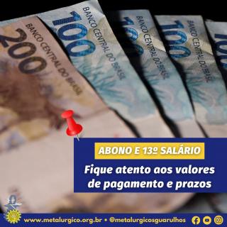 Abono - Na recente Campanha Salarial, o Sindicato conseguiu Abono de 13,5% pra todos. Será pago em duas parcelas. Dia 28 é a data pra empresa pagar essa primeira parcela, de 7%. A segunda, de 6,5%, deve ser paga até o dia 19 de dezembro.