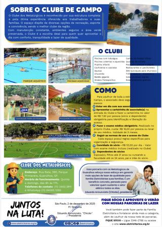 MAIS - O Clube de Campo fica na rua Reta, 390, Parque Primavera, Guarulhos. Funciona de quinta a domingo, das 8 às 17 horas. Telefones (11) 91367.1157 e 96314.4166. Acesso é asfaltado. Local é servido por várias linhas de ônibus. Estacionamento local dispõe de 800 vagas, gratuitas para os sindicalizados.