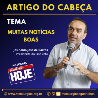 Edição do Guarulhos Hoje, neste sábado, dia 10, publicará o primeiro artigo semanal do nosso presidente Josinaldo José de Barros (Cabeça). No texto “Muitas notícias boas”, o dirigente ressalta as ótimas notícias aos trabalhadores brasileiros, também para os metalúrgicos ligados à Força Sindical e ao nosso povo, em geral.