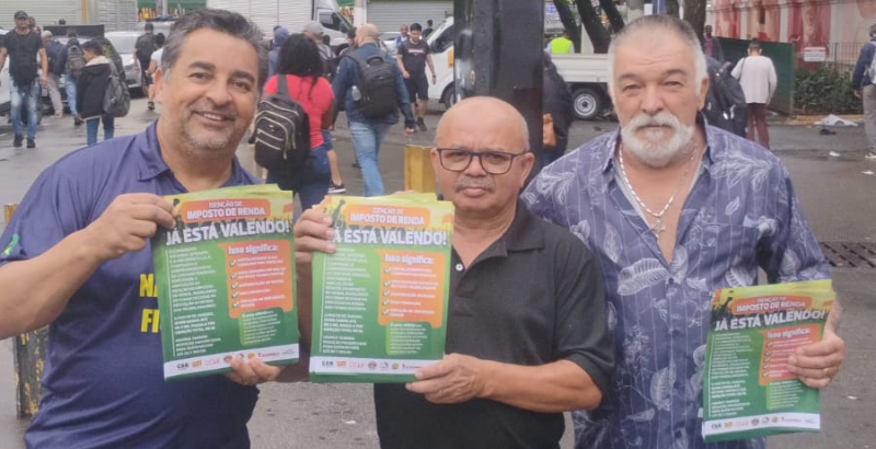 Na estação Brás, em SP, o Sindicato esteve representado pelos diretores Célio Malta e José João da Silva (Jau), acompanhados do assessor Valdir Planas, na distribuição de materiais informativos aos usuários do transporte público. Panfletos explicam a nova regra do IR e destacam o impacto positivo da medida no orçamento dos trabalhadores e de suas famílias.