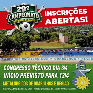 O Sindicato abre as inscrições nesta quinta, dia 19, para o 29º Campeonato de Futebol de Campo dos Metalúrgicos de Guarulhos e Região. Elas serão encerradas no dia 7 de abril (terça). A expectativa é superar o número de equipes da edição de 2025, que foi de 31.