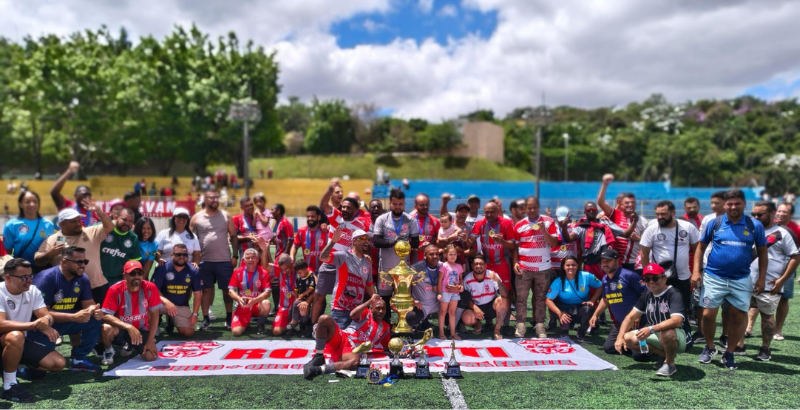 e ergue a taça do Futebol Veteranos