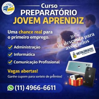 Nossa parceira PC Soluções Cursos Profissionalizantes está oferecendo um mega desconto de 30% para os sócios do Sindicato no curso preparatório para Jovem Aprendiz. As mensalidades, que são de R$ 210,00, saem por apenas R$ 147,00.