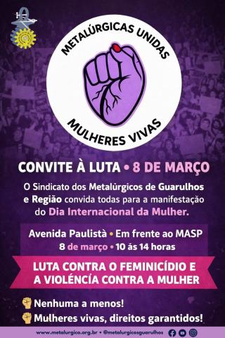 A Diretoria convoca todas as metalúrgicas e todos os metalúrgicos da base a se somarem a essa importante manifestação. Roseli, coordenadora do Departamento Feminino, destaca: "Sua presença fortalece a luta. Mulheres vivas, direitos garantidos. Participe!".