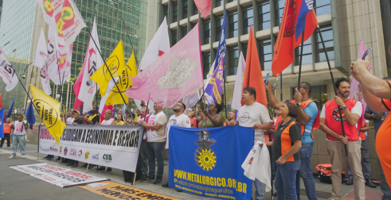 Delegação do nosso Sindicato participou da manifestação “Menos juros, mais empregos”, convocada pela Força Sindical, CUT, UGT, CTB, CSB e Nova Central Sindical, nesta terça (17). Ato ocorreu em frente ao Banco Central, na Avenida Paulista, SP.
